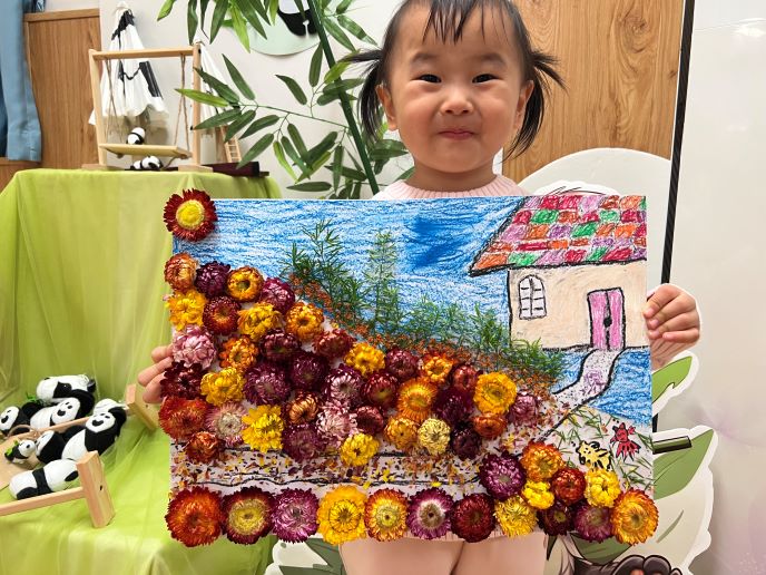 “泡过的菊花丢掉好浪费呀!”孩子们的一句话引发了新的思考。“除了泡水,菊花还可以干嘛呢?”老师的提问打开了创意的大门,“可以贴在纸上做手工!”小二班随即开展“菊花艺术展”创作活动。孩子们用干菊花、彩色卡纸、胶水等材料自由发挥,创作出一幅幅漂亮的作品。霜华染秋意,童趣润时光。这场以霜降为序、菊花茶为媒的探索之旅,在欢声笑语中落下帷幕。从对霜降的懵懂追问到对菊花茶的深度探寻,从初次冲泡的疑惑到二次调试的甘甜,从知晓苦味价值到干菊艺术新生,孩子们以感官为笔、实践为墨,在“发现—提问—探究—创造”的循环中,解锁了节气知识与生活技巧,更读懂了自然的馈赠与生活的智慧。传统文化在孩子们心中悄然扎根,探索的乐趣、合作的温暖与创造的喜悦,成为这个霜降最珍贵的印记,伴着清甜菊香,留在绵长的童年时光里。