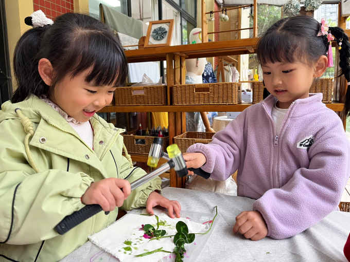 清明的诗意,伴着童声悄悄走进小班孩子们的心中,孩子们在聆听清明绘本故事中感知节日,在传唱童谣、吟诵古诗中理解清明。春日花香弥漫,中班孩子们正以独特方式感受清明美好。有的化身小小拓印师一锤一敲,将春天最绚烂的颜色印染于布上,留住清明最美的春色。有的则用一双双小巧手,制作清明传统美食——青团。揉一揉、搓一搓……把春的清甜包裹进青团之中,也把清明的传统滋味铭记在于心间。看!还有的正用画笔描绘春天的柳影,你一笔我一划,轻轻点缀出春天的模样,将清明美景悄悄画入画卷之中。